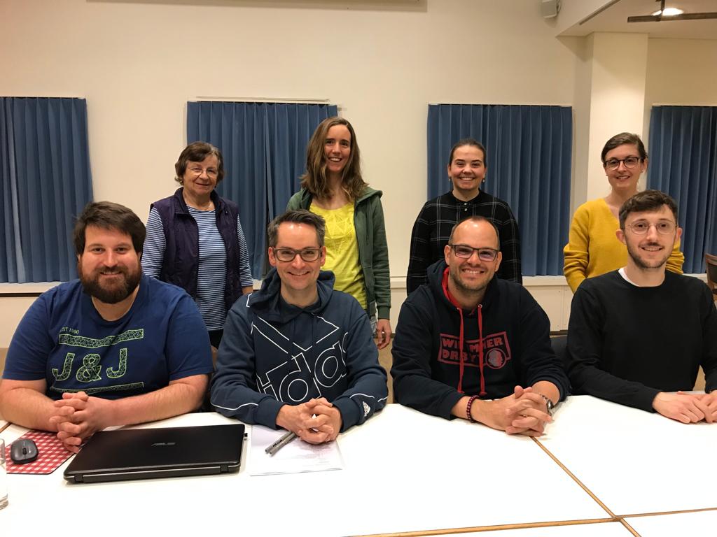 Die aktuelle Vereinsleitung: Christine Derendinger, Simone Hänni, Lena Müller, Sibylle Aeschimann (stehend, von links); Philippe Aeschimann, Marcel Zürcher, Bruno Zürcher, Dirigent Nino Wrede (von links). Es fehlen Pascal Rhunke, Jonas Beglinger.
